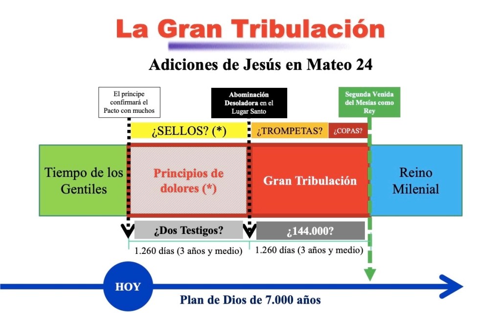 Entonces enfoquémonos esta vez en los eventos en rojo, que son los que corresponden propiamente a los que sucederán durante la Gran Tribulación. Sin embargo, como si la información que nos dejó Mateo fuera poco, luego Cristo mismo complementa la información dada a los apóstoles, cuando le presenta Su Revelación al apóstol Juan en Apocalipsis, ¡unos 70 años después!