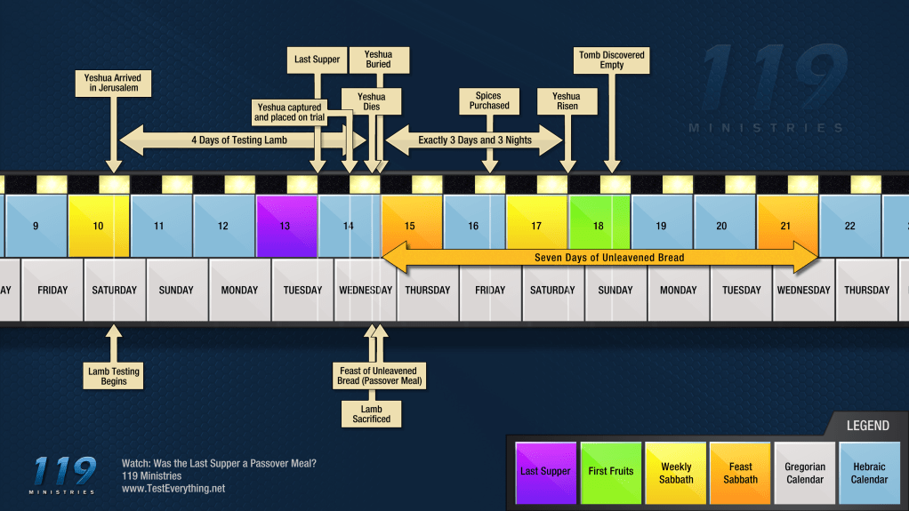 Durante el día, los discípulos se prepararon para celebrar la Pascua según las detalladas instrucciones de Jesús, y al atardecer (cuando ya en el calendario bíblico era miércoles), observaron la última cena de la que Jesús participaría (Mateo 26, Marcos 14, Lucas 22, Juan 13), que curiosamente no sucedió en el día de la Pascua propiamente (Nisan 15) sino en el día anterior (Nisan 14), el día “de la preparación de la Pascua”.